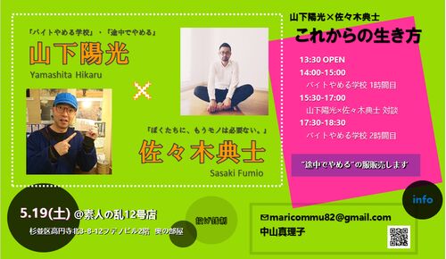 5月19日土曜日に、高円寺にある“素人の乱12号店”にて、『バイトやめる学校』の著者で『途中でやめる』というブランドの服を手がけている 山下陽光(やましたひかる)さんと、『ぼくたちに、もうモノは必要ない。』の著者 佐々木典士(ささきふみお)さんの対談イ…